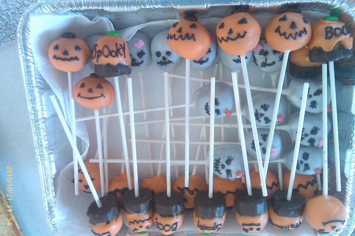 I had SO much fun making this order!! 4 dozen for a Tim Burton themed Halloween Party!! 1 Dozen German Chocolate Mummies, 1 Dozen Pumpkin Spice Pumpkins, 1 Dozen Red Velvet Jack Skellingtons, I dozen Devils Food Lollycakes with the Jack Standing on the Spooky Mountain and her 6 Free cupcake bites were Devils Food Sallys!! So super darling! I love these!!